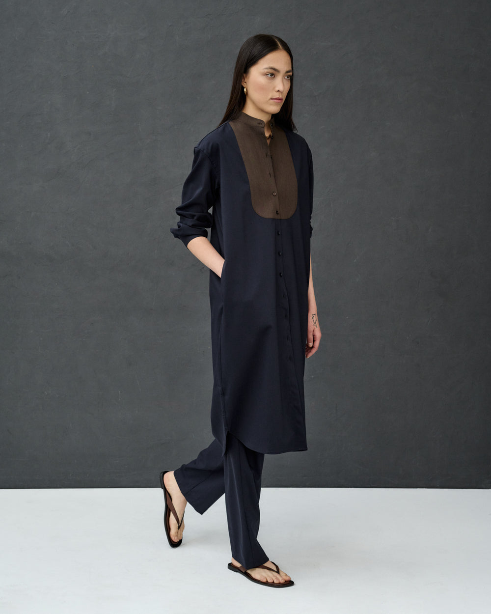Chloe Navy Wool Blend Shirt Dress with Bib